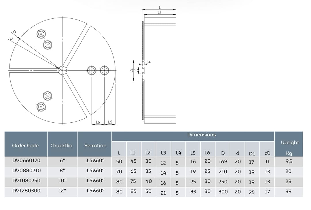 Order Code Chuck Dia Serration Dimensions Weight (Kg)