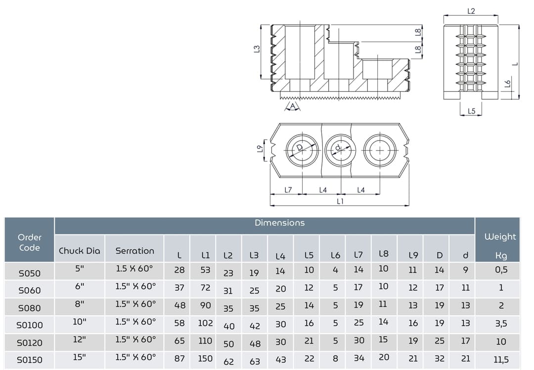 | Order Code | Chuck Dia | Serration | L | L1 | L2 | L3 | L4 | L5 | L6 | L7 | L8 | L9 | D | d | Weight (Kg) |