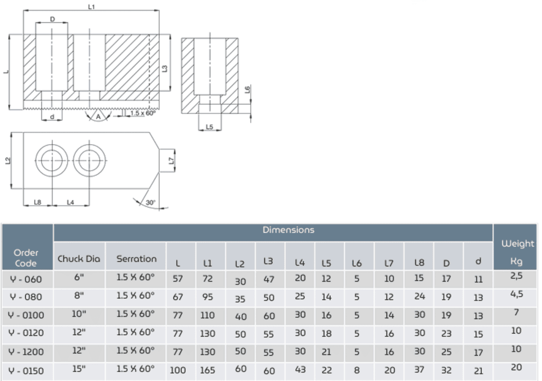 | Order Code | Chuck Dia | Serration | Dimensions | Weight (Kg) | ||||||||||
